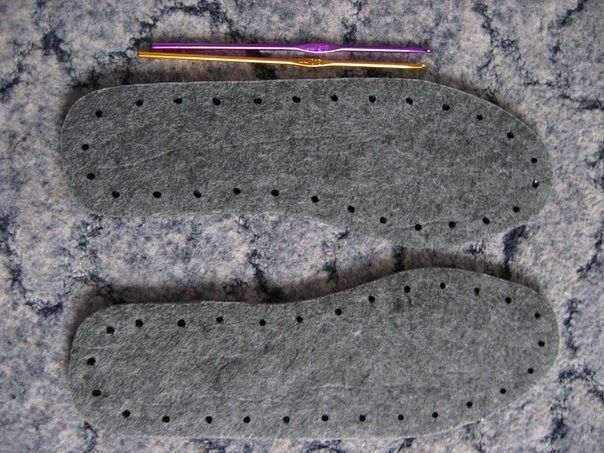 Берем обычную войлочную стельку (можно вырезать по своему размеру из любого доступного Вам материала: войлок, фетр, непромокаемый материал) и делаем дырочки с помощь шила, затем о...