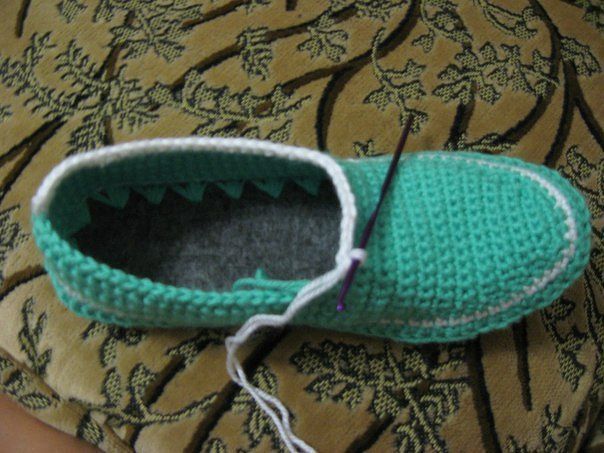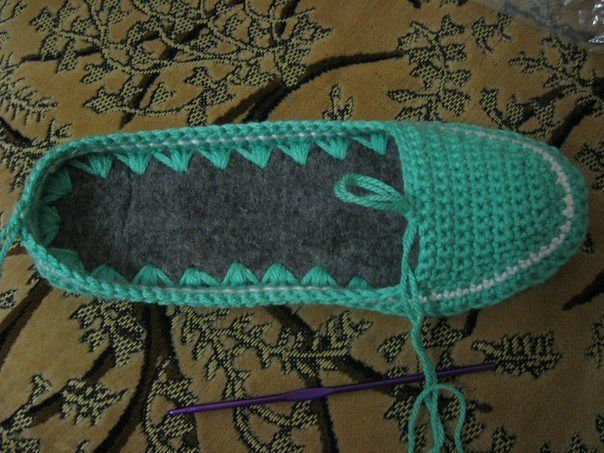 Тапочки крючкомОригинальные уютные следки крючком от дизайнера Dora Ohrenstein.Описание процесса вязания тапочек крючкомВерх стопы (связать 2 детали):1-й ряд (лиц. сторона): 7 в/п....