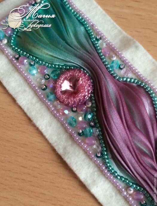 Затем — бисером N10,11. И крошечные пустоты — бисеромN15. На ленте шибори пришиваем немного бусин в произвольном порядке для того, чтобы волны не нарушились .