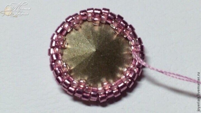 Потом вставляем риволи лицевой стороной вверх и оформляем изнанку. Плетем бисером N15 два ряда.