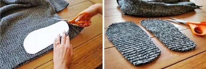2. Приложите выкройку к свитеру и приколите булавками. Вырежьте по контуру.