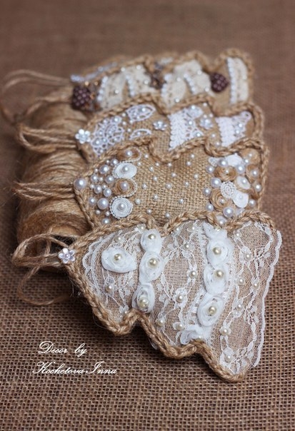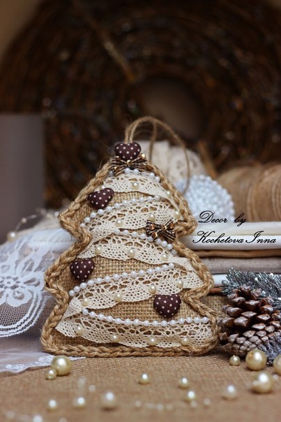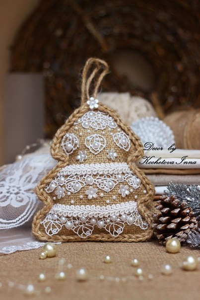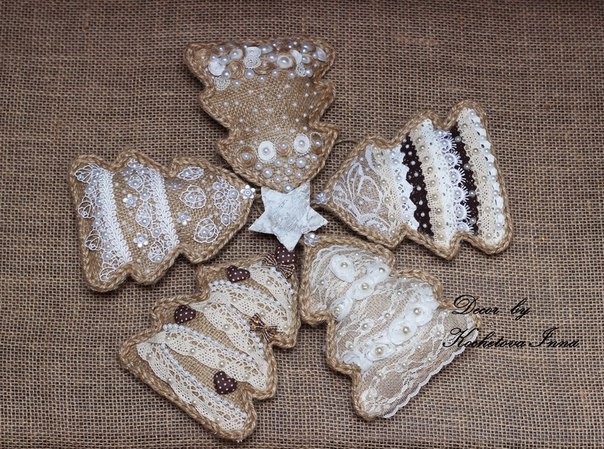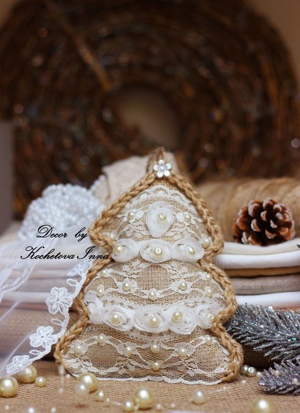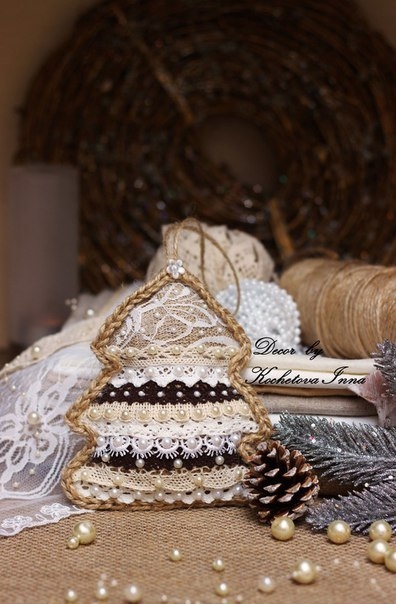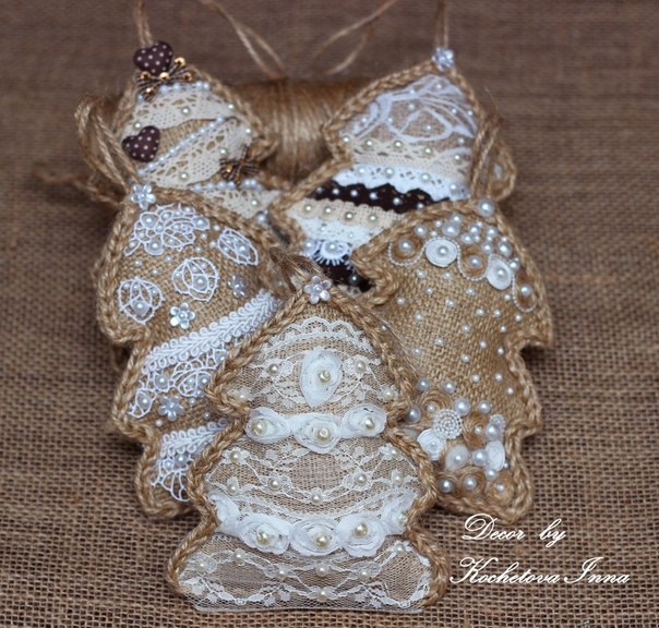 Винтажные ёлочкиЭти ёлочки в стиле шебби-шик с кружевами.