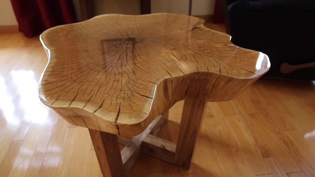 Наибольший интерес в этом столе представляет столешница. Для ее изготовления использовался срез дерева. Древесина пересохла и имеет множество трещин, благодаря которым образовался дивный узор. Еще благодаря этим трещинам внутрь дерева проходит эпоксидная смола, благодаря чему мы получаем после заливки очень крепкую и восхитительную конструкцию. В целом, благодаря эпоксидной смоле, можно использовать различные материалы, дерево может быть трухлявым или даже вовсе поросшим мхом. Благодаря эпоксидной смоле изделие будет долговечным и красивым.