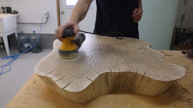 Приступаем к шлифовке столешницы. Для начала используем грубую обработку, выравниваем плоскость фрезером или электрорубанком. Материал теперь у нас монолитный, можно не бояться снять лишнего. После этого шлифуем плоскость орбитальной машиной или ручной ленточной. Что касается контура, то тут автор проходится вручную наждачной бумагой. На этом шаге столешница должна быть закончена, в итоге она будет покрыта защитным слоем эпоксидки или лака.