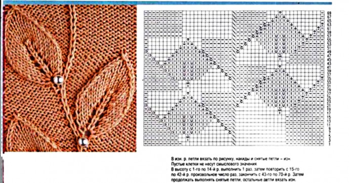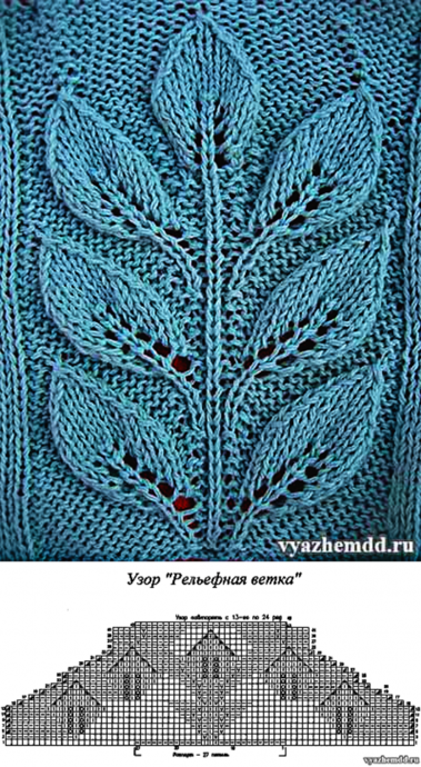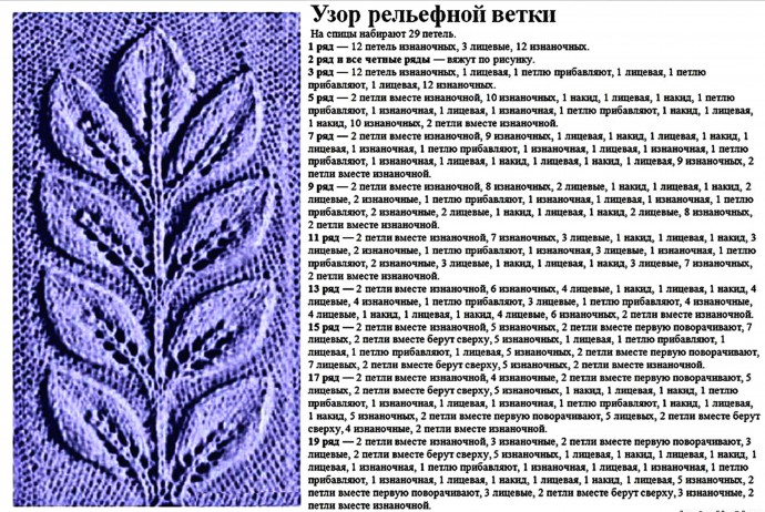 В раппорте схемы ветки встретится выражение: «одну петлю прибавить». Эта прибавка делается путем провязывания из перехвата изнаночной петли предыдущего ряда (то есть, одну петлю провязывают как бы дважды). Прибавленные петли по рисунку вяжутся лицевыми (поизнаночной стороне). Количество петель в рядах будет постоянно меняться, что придает рельефность листочков. На схеме узора с веткой имеется большое количество «пустых» клеточек (нет петли), которые надо игнорировать и переходить к вязанию только заполненных клеточек.