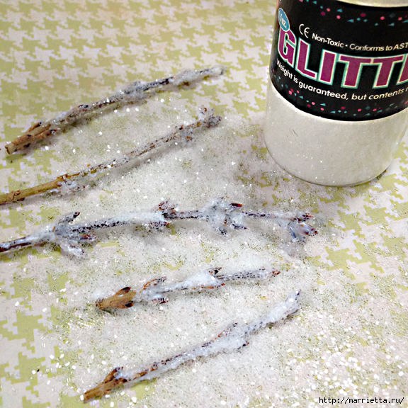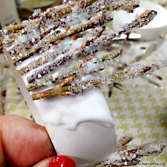Не сочтите за труд всё же ответить, ЧЕМ обсыпаны веточки? Зачем под фотографиями перечисление ненужных слов, не несущих полезной информации? Будьте щедрее в пояснениях. Вероятно, используется клей ПВА и соль, — правильно? Вот лучше бы в пояснении под фотографией указывали необходимые инструменты и материалы, и не возникало бы много ненужных вопросов. Спасибо за ответ!