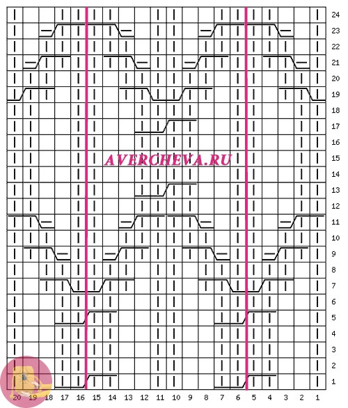 Раппорт узора 10 петель , в высоту повторяем с 1-го по 24-й ряд.