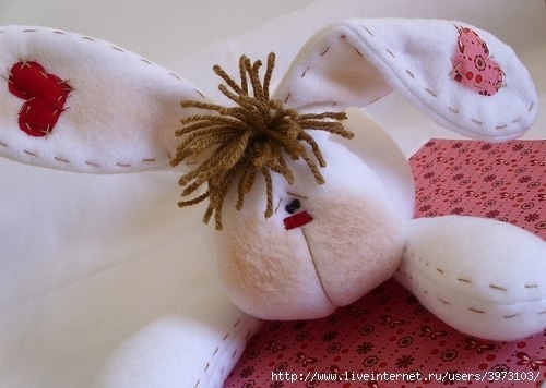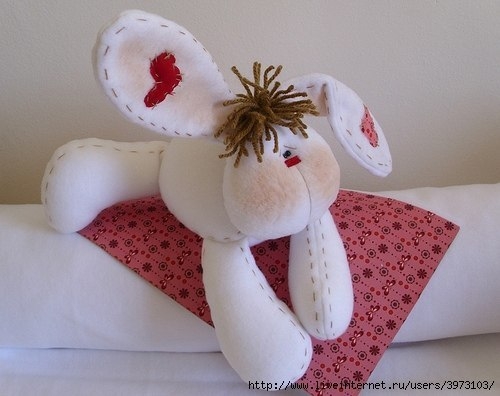 Интерьерный зайкаСам по себе зайка, как и его выкройка, очень простой.Вся прелесть в том, как он разукрашен.Лучше выбирать краски по ткани.Но если стирать зайца не планируется, то ...