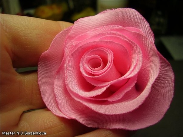 Красивая розочка из лентКрасивая розочка из лент отличается своим необычным внешним видом и угловатостью.Все это только увеличивает ее очарование.
