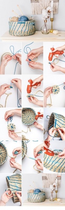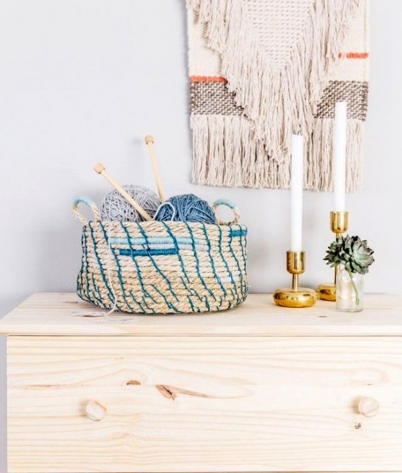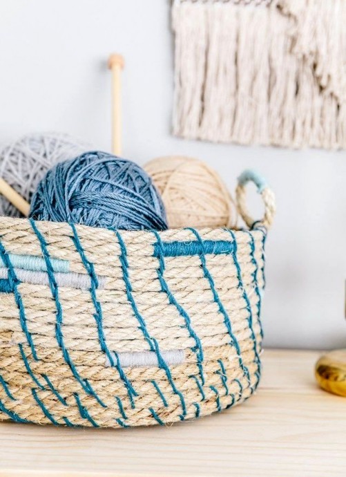 Корзины из верёвки практичны и красивы, в них может храниться много мелочевки.
