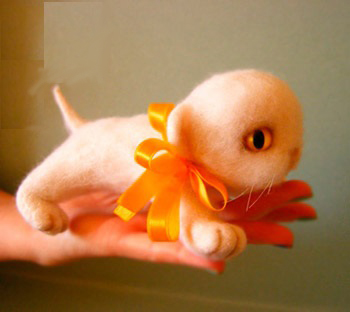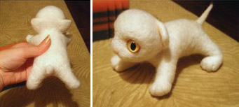 Теперь берём туловище-валик, обваливаем его шерстью, оставляя одну сторону не обработанной. Теперь приваливаем туловище к голове. Осталось сделать лапки, потому отделяем от гребенной ленты четыре одинаковых кусочка шерсти. Каждый кусок сваливаем в лапку и приваливаем к туловищу. Задние лапки в процессе загибаем, сваливаем хвостик и также приваливаем.