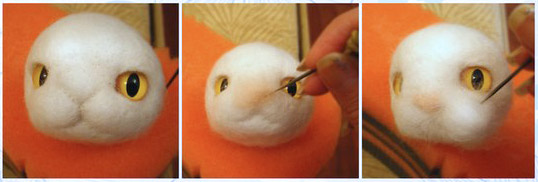 Нарываем пуходеркой белую шерсть, если нет пуходёрки, делать это можно руками. Делаем это небольшими кусочками и затем перемешиваем волокна, приваливаем их к шерсти иглой №40. Глазницы углубляем иглой и берём шило, прокалываем им отверстие в серединке глазниц. Затем отверстие нужно при помощи ножниц расширить и углубить. Глазки примеряем и плотно прижимая приклеиваем, делаем из кусочков шёрсти веки и приваливаем их сверху и снизу глаза. Намечаем линию носа иглой №36, а также линии щёчек, рта, к носику нужно привалить кусочек шерсти розового цвета, намечаем ноздри и добавляем объём для щёчек.