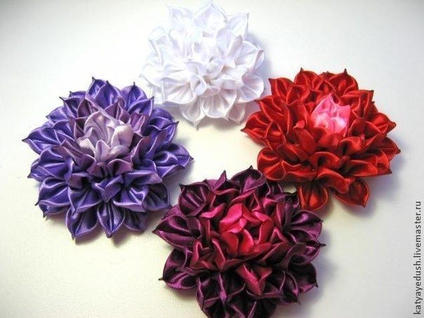 Георгин из лент в технике канзаши: мастер-классТехника декорирования предметов цветами, сделанными из кусочков цветных лент, называется канзаши. Она пришла в европейские стран...