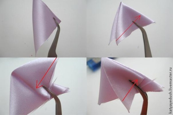 Цветок в технике канзаши: мастер-класс 1. Складываем квадратик в 4, как на узкий лепесток. Зажимаем пинцетом в том месте , где будет заканчиваться первая складочка.2. Запаивае...