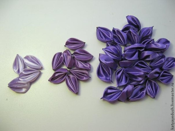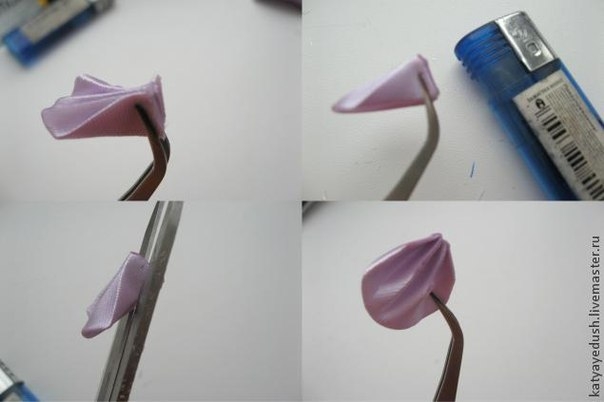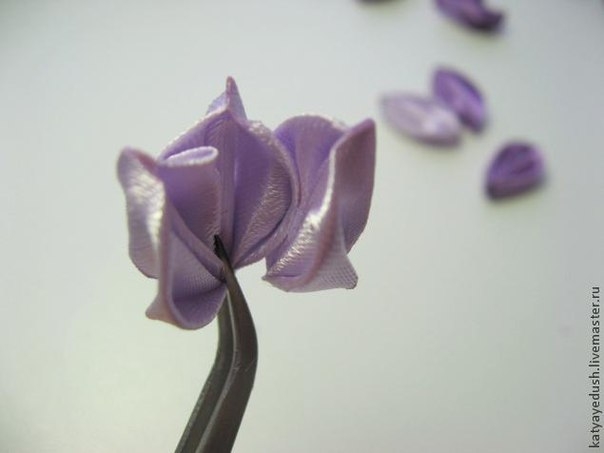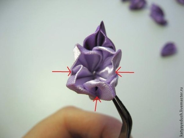 Роза в технике канзаши: мастер-класс, часть 3Автор Кудрякова Ольга.17. Берем еще две маленькие заготовки и приклеиваем их к нашему бутону напротив друг друга. У нас получился вот т...
