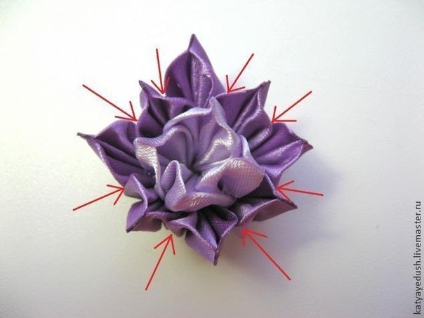 Роза в технике канзаши: мастер-класс, часть 4Автор Кудрякова Ольга.23. Для второго круга тоже используем 6 штук.24. Для 3 и 4 круга я уменьшила оставшиеся лепестки. Подогнула уголк...