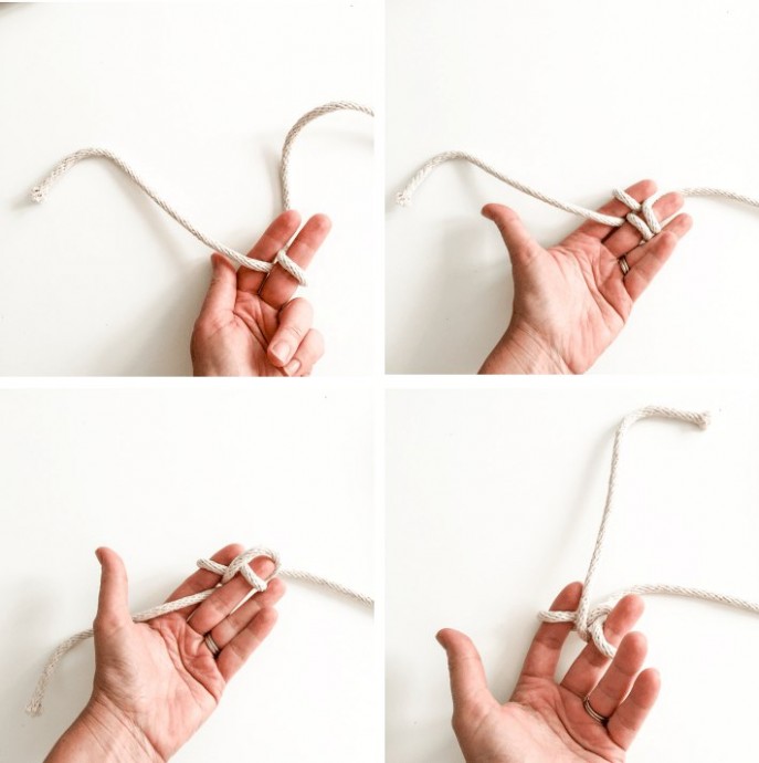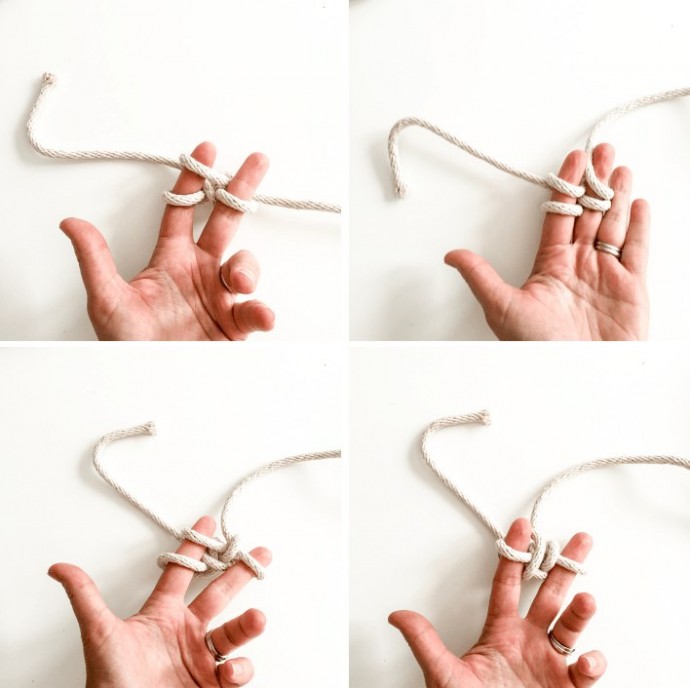 А у меня, кажется, получилось) Накидываем рабочий (длинный) конец шнура поочередно на левый и правый палец восьмеркой. На каждом получается по две петли. А потом нижнюю петлю скидываем с пальца, а верхняя остается, сначала с правого пальца п, потом с левого. И так повторяем до нужной длины шнура. Петля восьмерочкой на оба пальца, на пальцах по две петли. Нижнюю скинули через верхнюю, верхняя остается на пальце. Вот на 3-й карт. процесс снятия нижней петли. На 4-й карт — это важно — процесс закрепления второго конца шнура, которым будем формировать из шнура круг… Единственное, на мой взгляд, неудобство — будет ли держаться круг, если его закреплять в одной лишь точке. Шнур ведь ведь толстенький.