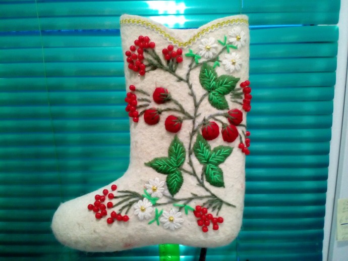 Ну и что же они завидуют и не покупают? Дефицит, что ли? Я говорю о том, что наши производители могли бы пошевелить мозгами и сшить современную обувь с применением войлока. Я на улице подошла к одной женщине, у нее были финские валенки, но очень современные, прекрасный современный силуэт, на толстой подошве и на каблуке, в них гнется и подошва и в подъеме, чего не скажешь об этих валенках. Если же гнутся, то сделан тонкий войлок, и они холодные, если толстый войлок, то ничего не гнется. Но она была недовольна — их чистить очень сложно или вообще нельзя чистить. А приходить в восторг от вышивки на валенках наивно.