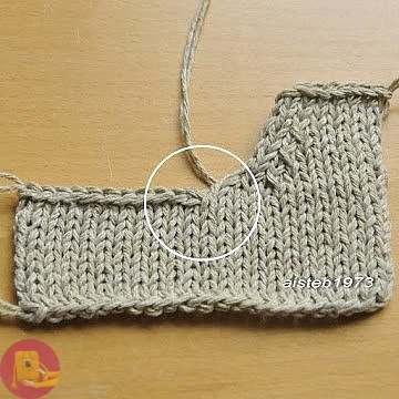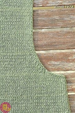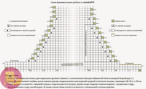 Эту формулу и схему я использовала уже не в одной модели, и тут показываю, как выглядит пройма, связанная таким образом. Mои модели Slope и Prickly Poppy (показана изнаночная сторона. Эта модель вяжется читая схемку на изнаночной стороне изделия, так как на лицевой стороне - изнаночная гладь, см. схему, примечание No. 3)
