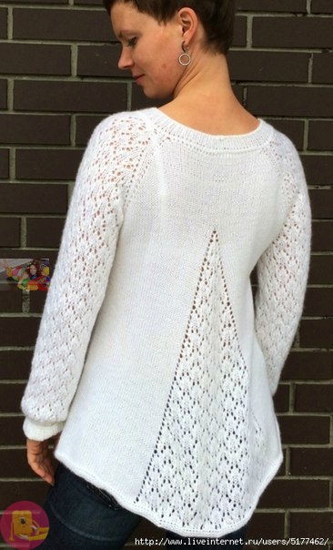 Спинка: на высоте 14 см от начала вязания отметьте среднюю петлю и начните вывязывать ажурную вставку. На высоте 66 рядов от начала вывязывания регланных линий снимите петли рукавов на дополнительную нить, а петли переда и спинки замкните в круг и продолжайте вязание по кругу. Через 38 см провяжите 3 ряда платочной вязкой и петли закройте.