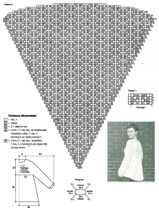 Ажурный узор: вяжите по схеме 1, на которой даны только лиц. ряды. В изн. рядах петли и накиды вяжите изн. п.