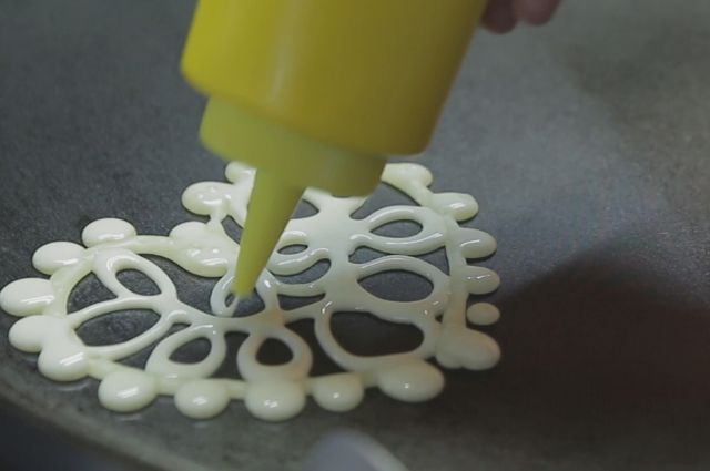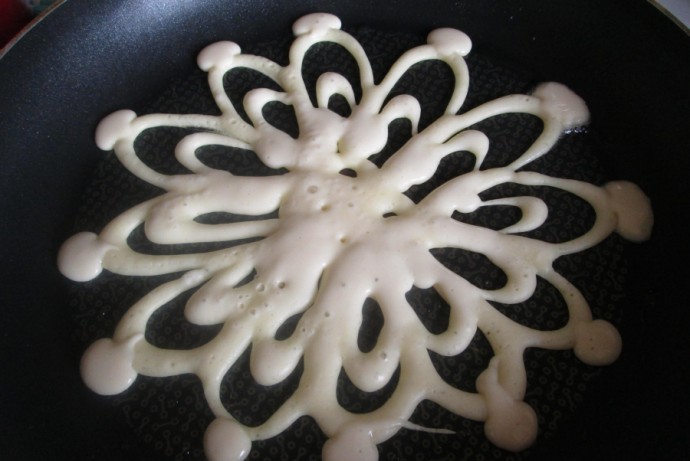 Достаточно залить тесто в бутылку и проделать в крышке дырочку, чтобы удобно наливать на сковородку.