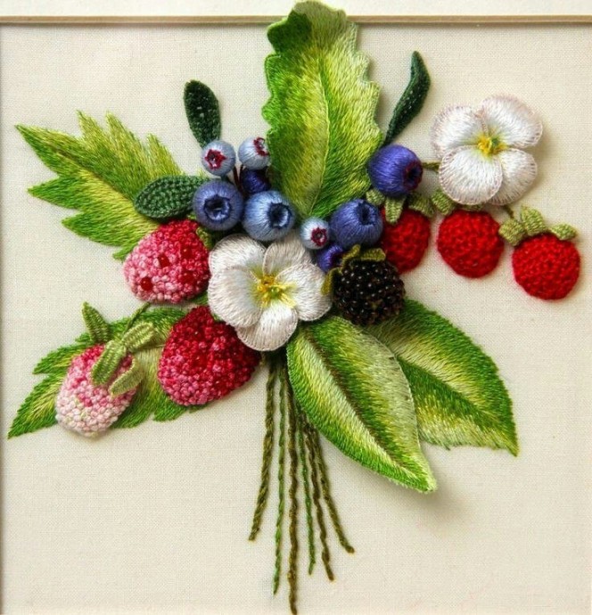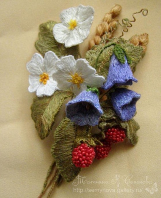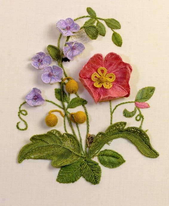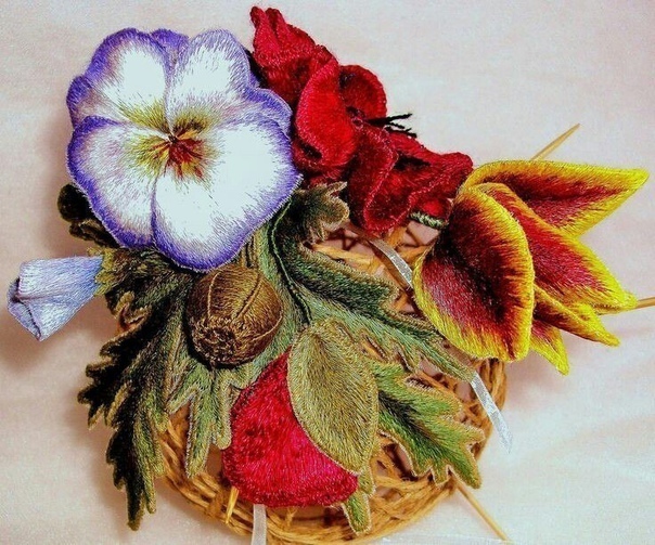Поищите МК в интернете — «объемная вышивка», а еще лучше искать на ютубе типа «объемная вышивка для начинающих. Могу сказать, что смысл объемной вышивки — в вышивании отдельных элементов и прокладыванием по краю тонкой проволоки, в вырезании и последующей сборке. Желаю всем, кто хочет научиться, удачи в освоении этой техники!