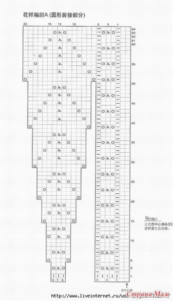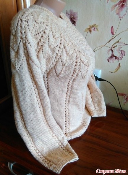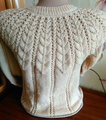 После вывязывания узора провязать еще 4 рядо вкруговую, затем разбить на рукава, спинку и перед.Спинку провязать еще 6 рядов, это и будет росток.