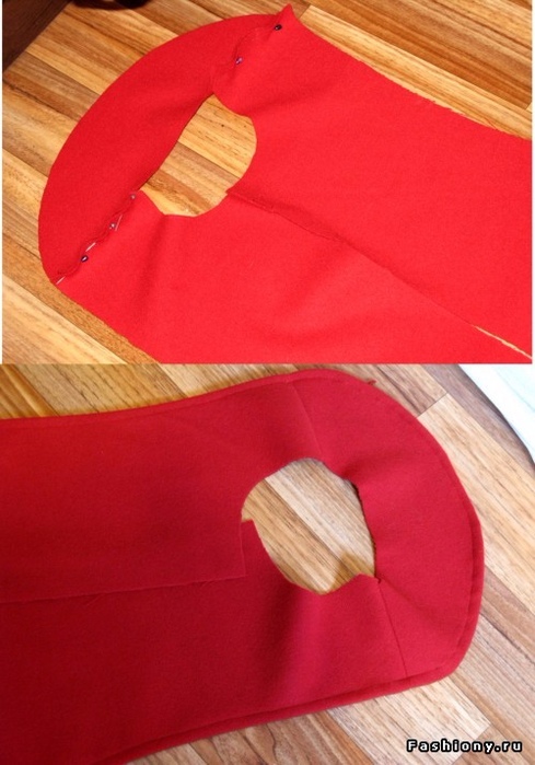 7. Переходим к воротнику. Необходимо продублировать нижний воротник. Сложить верхний и нижний воротник лицевыми сторонами внутрь, сколоть, обтачать с 3- х сторон. Срезать припуски шва, для того, чтобы удобно было вывернуть воротник.