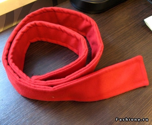 16. Осталось дело за последним. Пояс. Процесс я не снимала, но по фото, думаю все будет понятно. Стачиваем с двух сторон, выворачиваем на лицевую сторону. Затем прокладываем декоративную строчку, на расстоянии примерно 1-1,2 см.