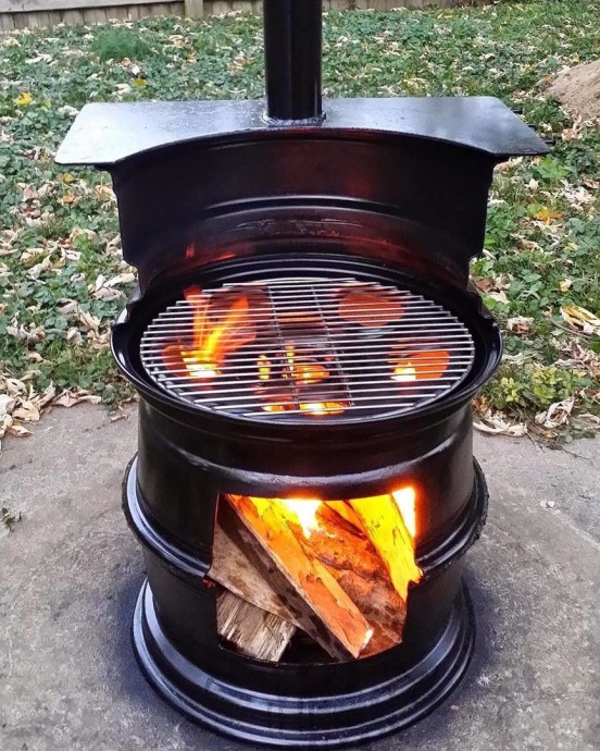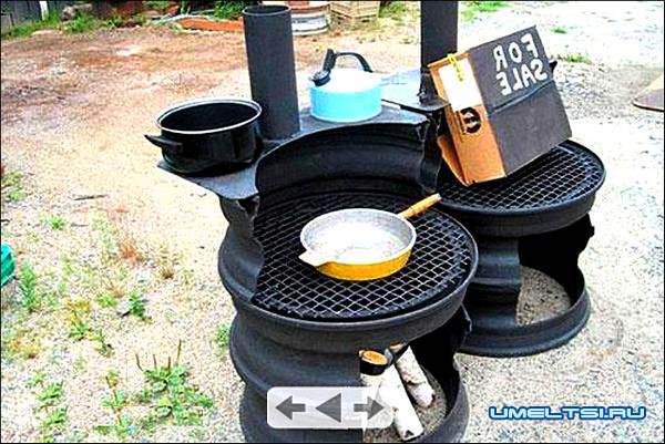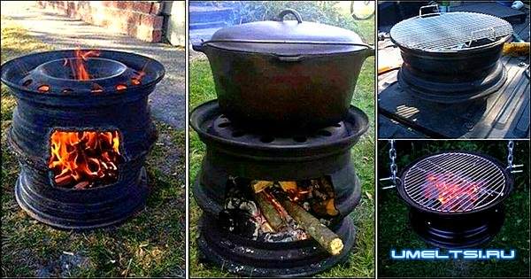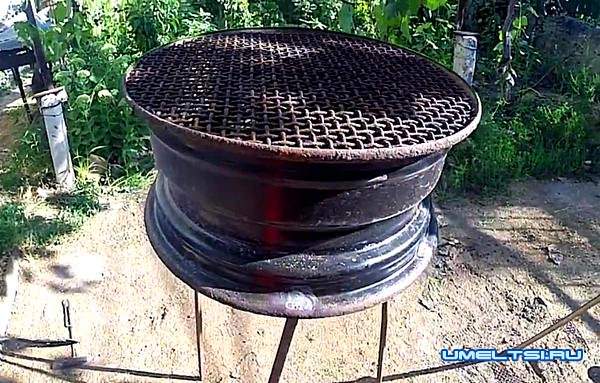 Вниз мы кладем дрова или приготовленные угли. Сверху ставится решетка или укладываются шампуры. Предметы посуды можем расположить тоже на решетке или прямо на колесе, если подходит размер.