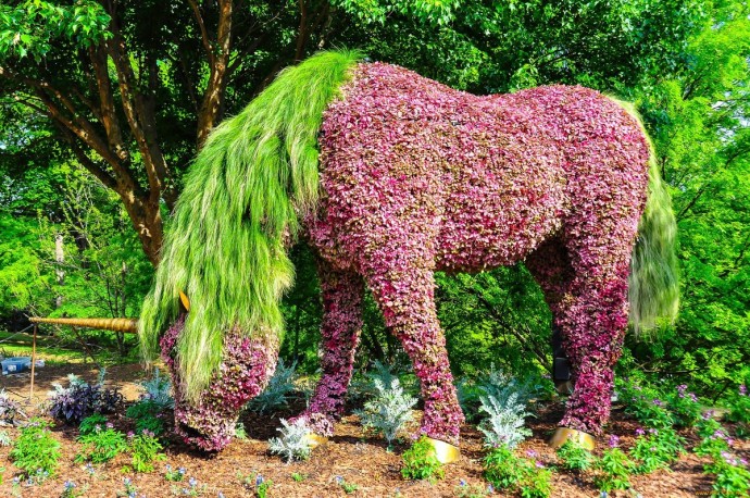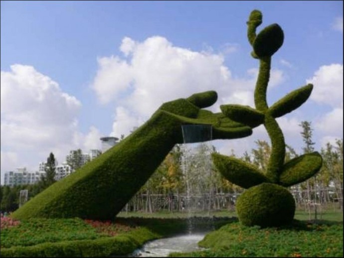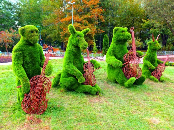 А по-моему это другая технология. Делается скульптурная основа, а растения подсаживаются по всей поверхности в ячейки покровной сетки (под сеткой — грунт). Это тоже большой труд, но на один сезон. Мне особенно понравился кот на третьем фото. Спасибо!