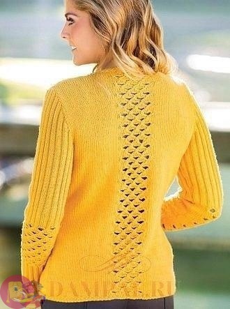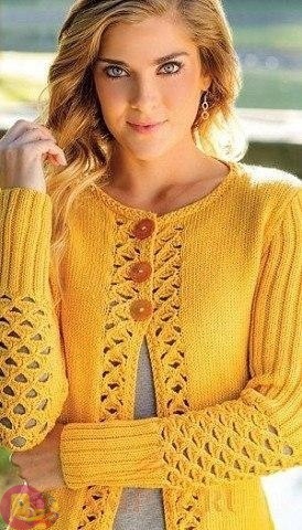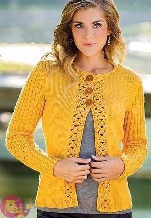 Желтый кардиган можно выполнить со сплошной застежкой. Для этого нужно пришить дополнительные пуговицы и использовать для петель отверстия на планке правой полочки.