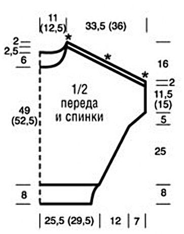 Выполнить плечевые швы у внешних и внутренних краев на 1 см соответственно, а также посередине на 3 см (см. отметки * на выкройке).