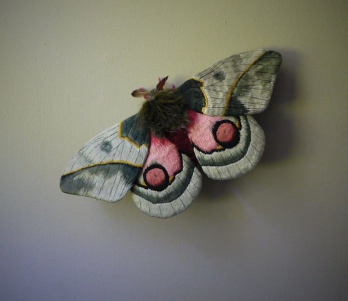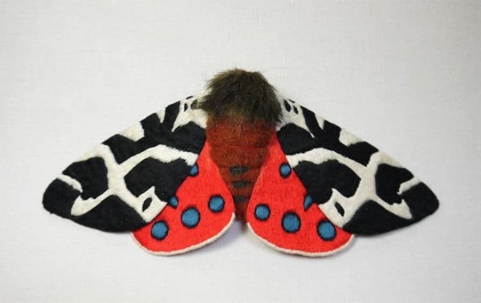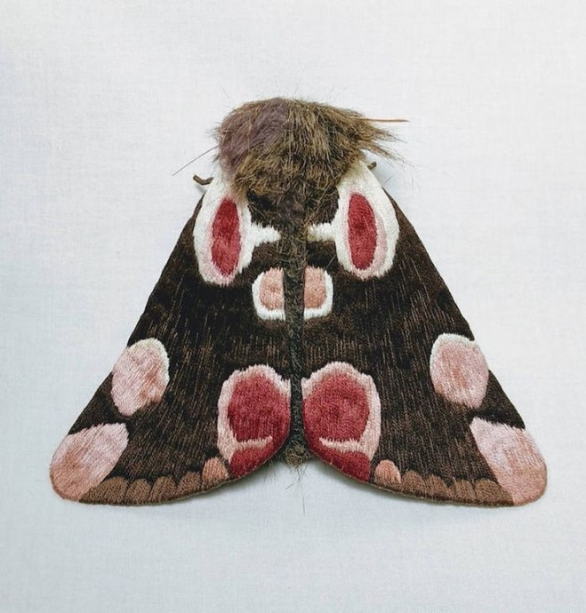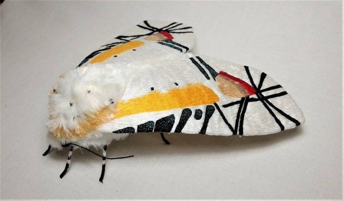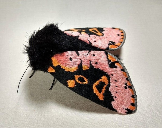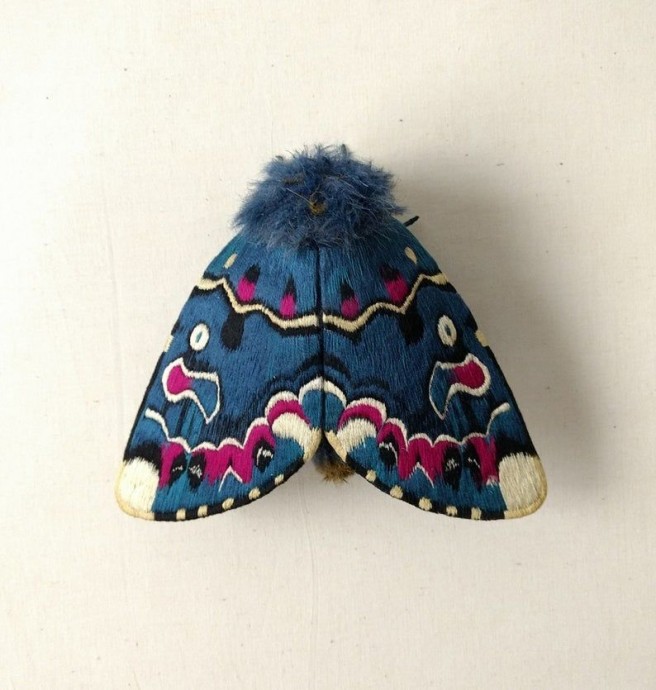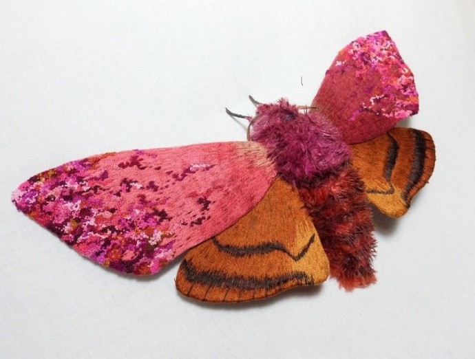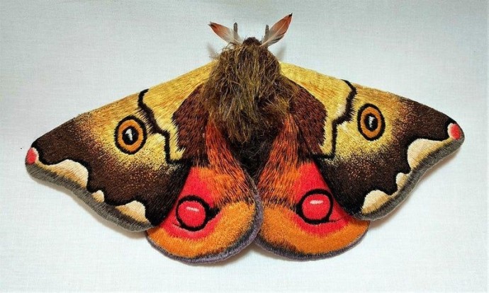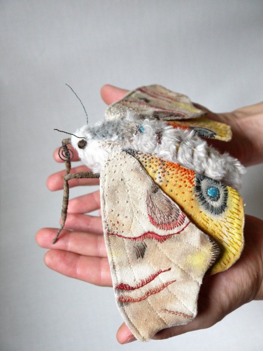 Я думаю, тельце выполнено из «травки», а крылья — из тонкого фетра и ткани с вышивкой длинным стежком и гладью. Лапки и усики — проволока, я бы взяла медную. Но на одном снимке бабочка в руках, и мне не нравится, что она такая здоровенная.
