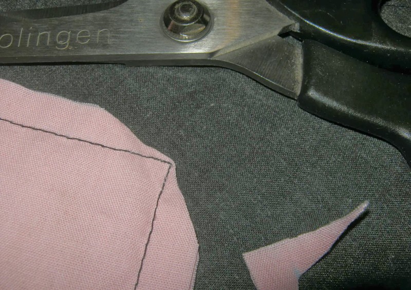Обрезаем припуски на швы в районе прямого угла так, как показано на фото, не дорезая до самого угла 1 мм. Теперь, если вывернуть ткань, этот угол будет выглядеть ровным и красивым.