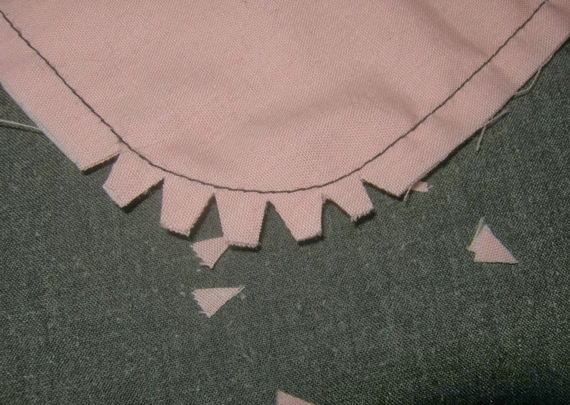 Переходим к полукругу. Для того, чтобы убрать складки, необходимо вывернуть деталь наизнанку и на местах, где ткань образует складки, сделать вырезы в виде буквы V.