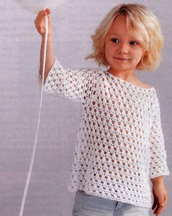 Очаровательная блузка с ажурным узором будет одинаково хорошо смотреться как на ребенке, так и на взрослой женщине.