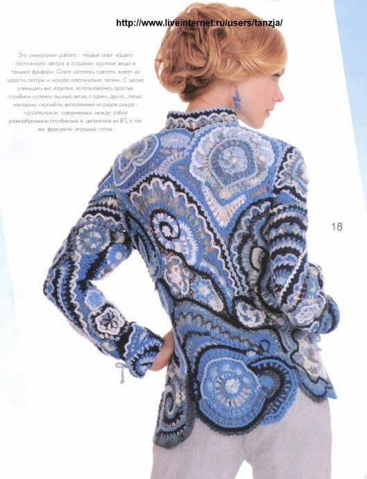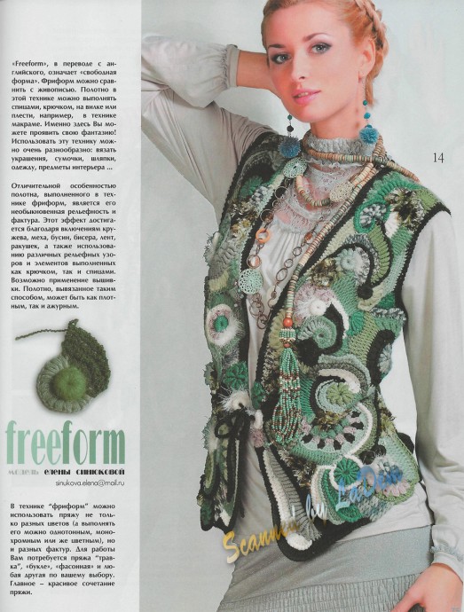 Freeform в переводе с английского языка означает «свободная форма». Рукодельница сможет в одном творении применять детали, выполненные при использовании крючка, спиц, вилок. Также возможно сшивание элементов с помощью иголок или привязывание одного к другому. Как и в любом изделии, главным станет соблюдение чувства меры и эстетического вкуса. Выбор цветового сочетания будет зависеть от собственных ощущений и полета фантазии каждой личности.