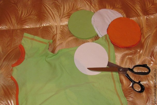 Итак, начнём. Из предварительно выстиранных вещей (футболки, водолазки и т. д.) вырезаем круги разных цветов, обводя по шаблону маркером.