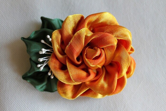 Красивый цветок из широкой атласной ленты найдет широкое применение как в одежде, так и в интерьере.