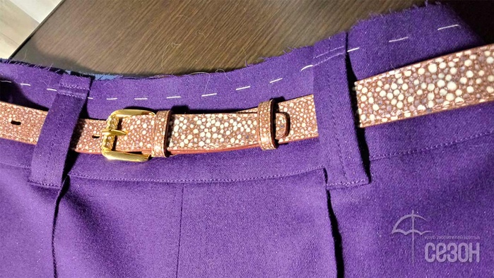 Первой к верхнему срезу брюк прикладываем широкую шлёвку.