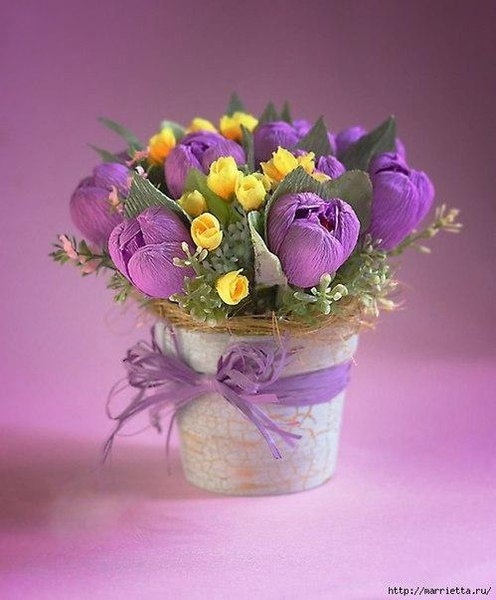 Букетик крокусов из гофрированной бумагиПока земля спит под снегом, цветы хороши будут любые.