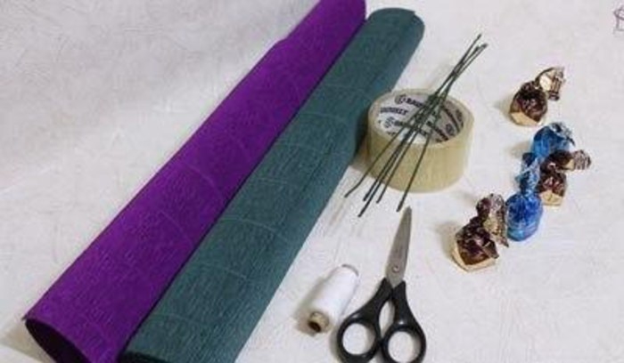 Букет крокусов из конфет и гофрированной бумаги: мастер-класс
