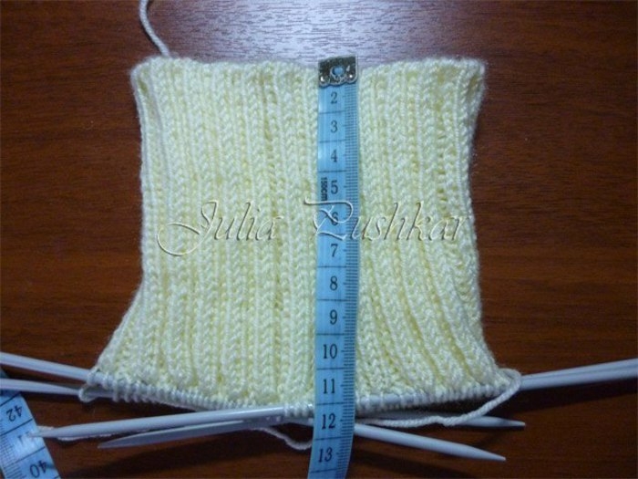 В пятом ряду замыкаем петли в кольцо и вяжем на чулочных спицах 10-11 см резинкой 2*2.