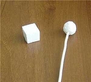 Сначала делаем заготовку шарика из пенопластикого кубика размером 2*2*2см, вставляем стержень, который закрепляем ПВА.