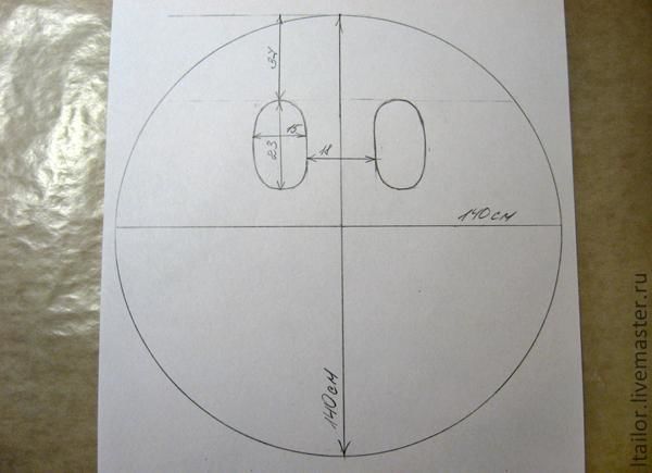 Изделие практически безразмерное, на мой взгляд. Но рекомендуемые размеры все-таки 42-46 при росте 170 см. На большие размеры я изделие не примеряла, а на меньших размерах и ростах смотрится несколько громоздко. Но можно немного изменить выкройку, уменьшив ее диаметр и диаметр внутренних пройм, и все получится замечательно даже для меньших размеров.