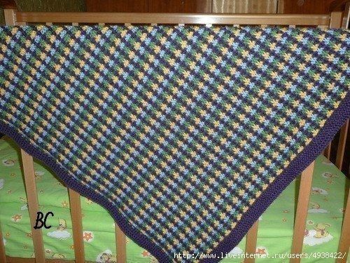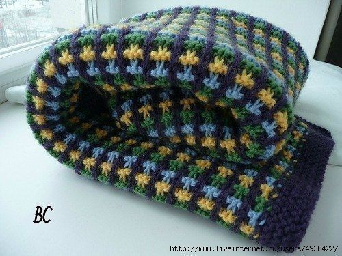 Рельефный плед в коляску узором из снятых петель. Размер примерно 76 на 76 см, вес 625 г. Пряжа Vita (Stella, Sapphire, Pure Wool) в 2 нити, подбиралась из цветов, имевшихся в магазине.