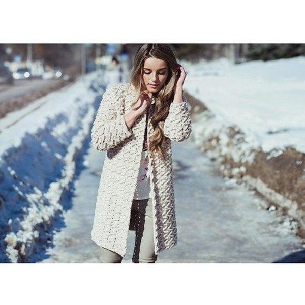 Вязаное пальто с узорамиРазмер: 44.Вам потребуется: 1200 г пряжи молочного цвета (50 % шерсть, 50% акрил, 240 м/100 г), спицы № 5, 8 пуговиц. Резинка 1 на ...