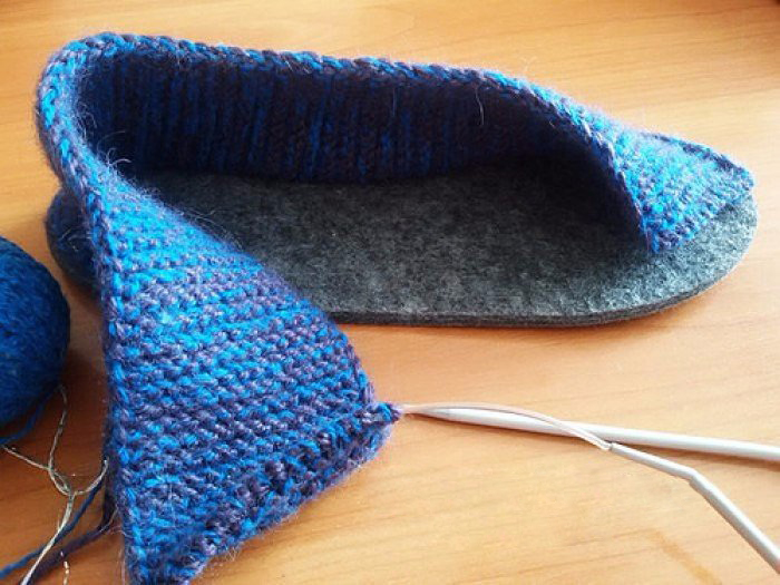 Начинать сшивание удобнее всего с передней части тапочка, с носка, и идти по кругу против часовой стрелки.
